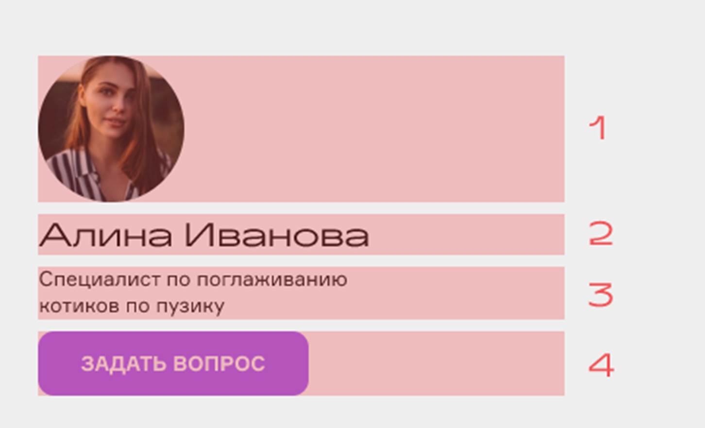На картинке мы видим фотографию специалиста, имя и фамилия, должность, а также предложение о помощи. Как можно отметить, наиболее широким блоком является фотография, поскольку это первое, на что обращает внимание каждый посетитель сетевого ресурса. Далее акцентируется внимание на ФИО и должности, поэтому эти поля имеют приблизительно одинаковую ширину выступов. Ну и, наконец, завершается знакомство предложением задать вопрос, где мы видим расширенный отступ. Это обуславливается особым значением поля, которое побуждает человека к действию.