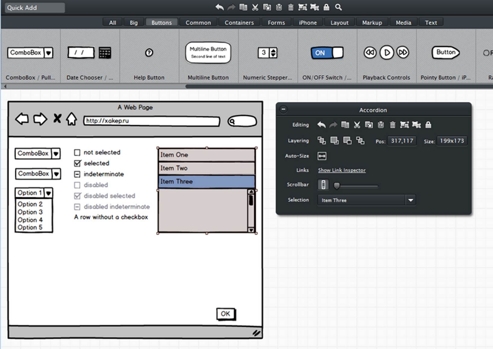Это один из первых инструментов, специально разработанных для вайрфреймов/прототипов. Интерфейс довольно простой, но в целом актуальный и удобный на сегодняшний день. Именно этот инструмент считается самым широко используемым в профессиональной среде.